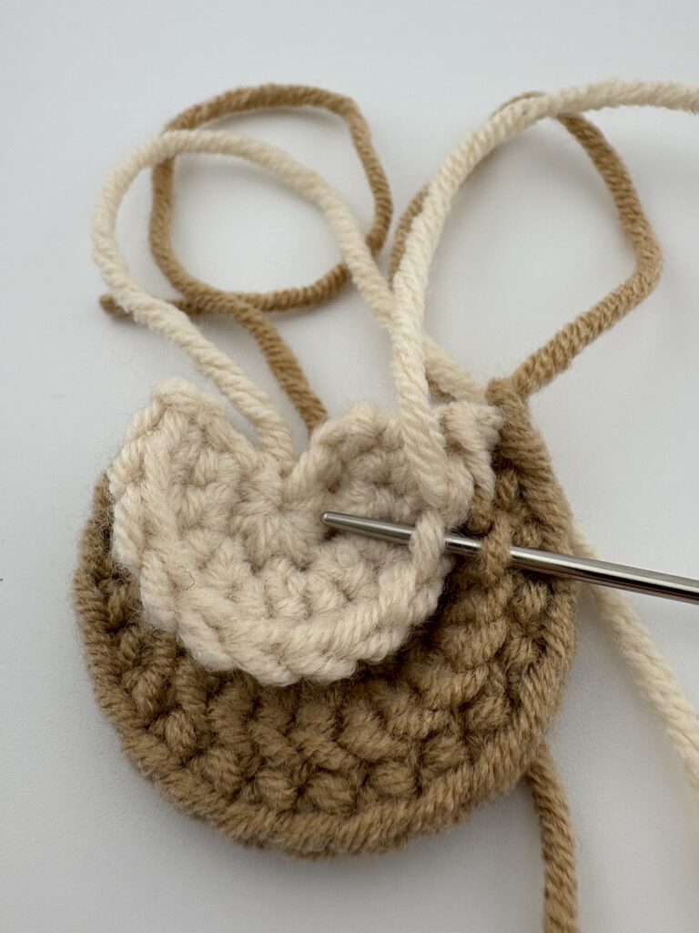 R18: with beige – 1 dec, 6 sc, 1 dec; with khaki – 3 sc, 1 dec – rep 4x [24]